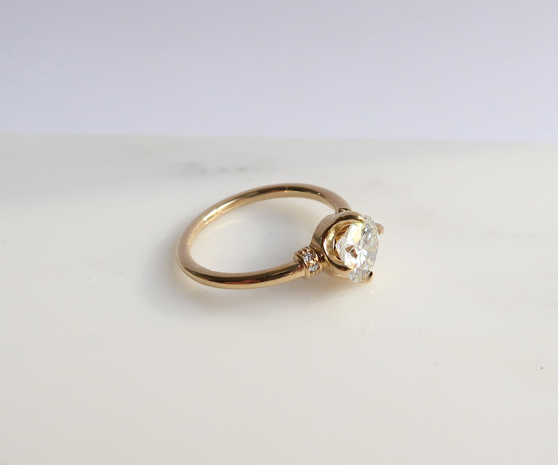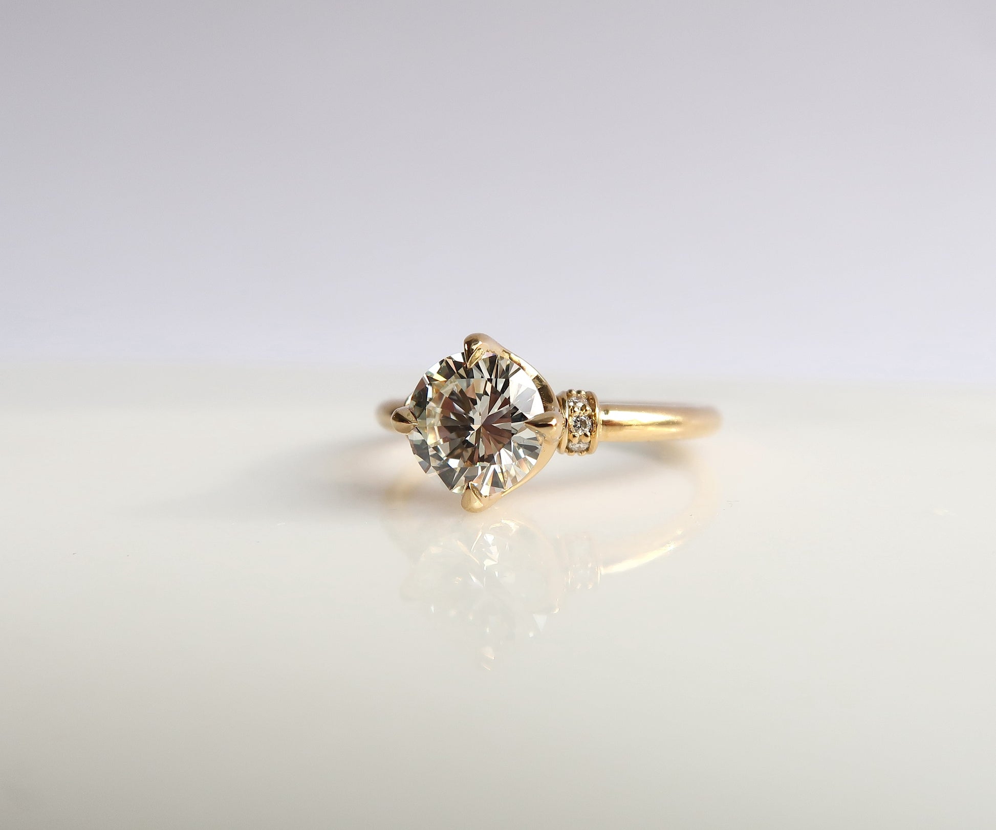 Centering on a prong set round brilliant cut natural diamond, accented with natural diamond rondelle shoulders in a tapered 18K yellow gold band.